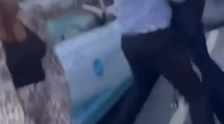 As the officer moves to restrain him, the man suddenly starts swinging and shoving, initiating a full-on physical fight. The officer tries to maintain control, grabbing the man’s arms and attempting to bring him down, but the resistance continues for several tense moments.