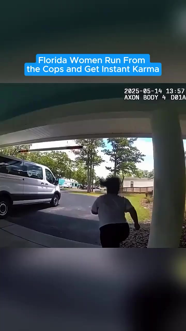 Within seconds, the chase ends abruptly. What many online are calling “instant karma” plays out in real time, leaving viewers stunned by how quickly the situation flips. The woman’s attempt to escape doesn’t end with freedom — it ends with her stopped in her tracks, exactly as officers warned.