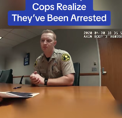 The video, recorded on bodycam inside an interrogation room, captures the officer sitting stiffly at a table as investigators present him with evidence. The caption says it all: “When corrupt cops realize they’ve been arrested.” His blank stare and tense posture tell the story of a man who has spent years putting others in handcuffs — and now finds himself on the opposite end of the law.