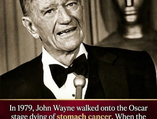 When John Wayne stepped onto the Oscar stage in April of 1979, the entire room rose to its feet as if lifted by a single heartbeat. The Duke had been part of Hollywood’s identity for half a century, yet this appearance felt different—fragile, historic, almost sacred. Just three months earlier, he had survived a brutal nine-hour surgery that removed his entire stomach after doctors discovered cancer. He had beaten lung cancer once before, in 1964, losing a lung and several ribs in the process. Now seventy-two, thinner and weakened but determined, he arrived at the Dorothy Chandler Pavilion because he refused to let illness define his final chapter.