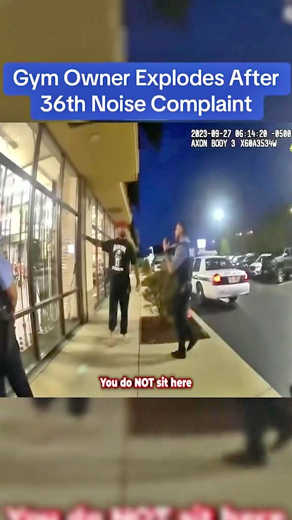 According to the footage circulating on social media, officers arrived at the gym in response to yet another noise complaint. The gym, located in a commercial strip with nearby parking, appeared closed to the public at the time, but sounds from inside had prompted calls from nearby residents. When police approached the entrance, the gym owner stepped outside, visibly frustrated and animated.