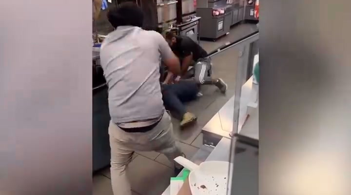 Video footage shows multiple workers confronting the suspect behind the counter area. At one point, one of the employees can be seen using a stick-like object to defend himself as the suspect tries to shield himself and back away. The chaos escalates quickly, with items knocked over and tension filling the small space behind the counter.