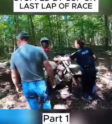 The video, filmed from the racer’s helmet cam, shows him tearing through a wooded trail, seconds away from finishing the last lap. The sound of the roaring engine, the dirt kicking up behind the bike, and the cheering spectators paint a picture of pure adrenaline — until flashing lights suddenly appear ahead.