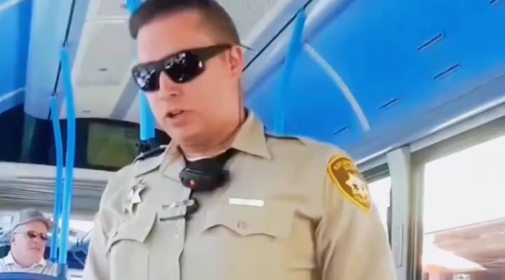 The scene takes place inside a calm, brightly lit bus, where passengers sit quietly as an officer steps onboard. His tone is firm, his sunglasses hide his expression, and he immediately confronts a man sitting mid-row. What starts as a simple question quickly escalates into confusion for everyone watching.