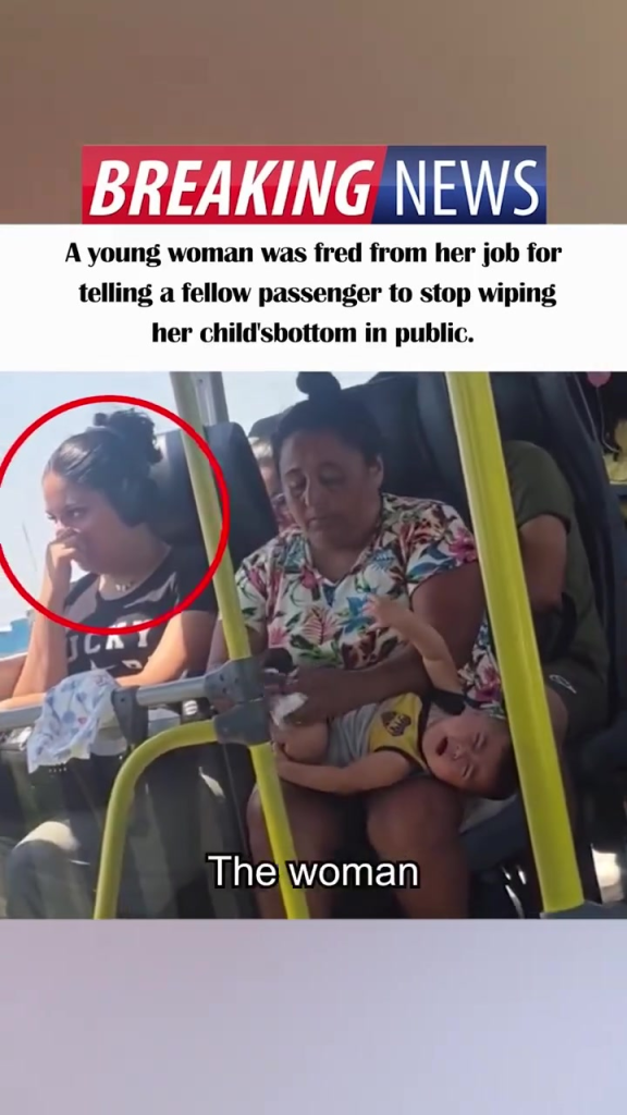 The image circulating online shows a crowded bus scene. In the center, a wman appears to be tending to a chld seated on her lap, while nearby passengers look away or remain silent. According to the on-screen headline, another passenger — later identified in captions as a young wman — allegedly told the caregiver to stop wiping her chld’s bottom in public. Shortly after, the post claims, that same w*man lost her job.