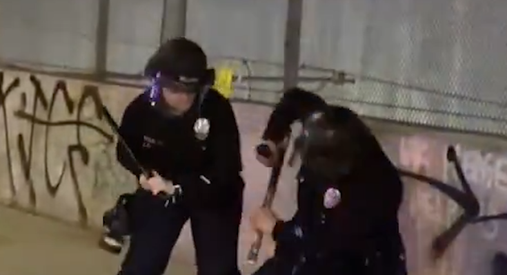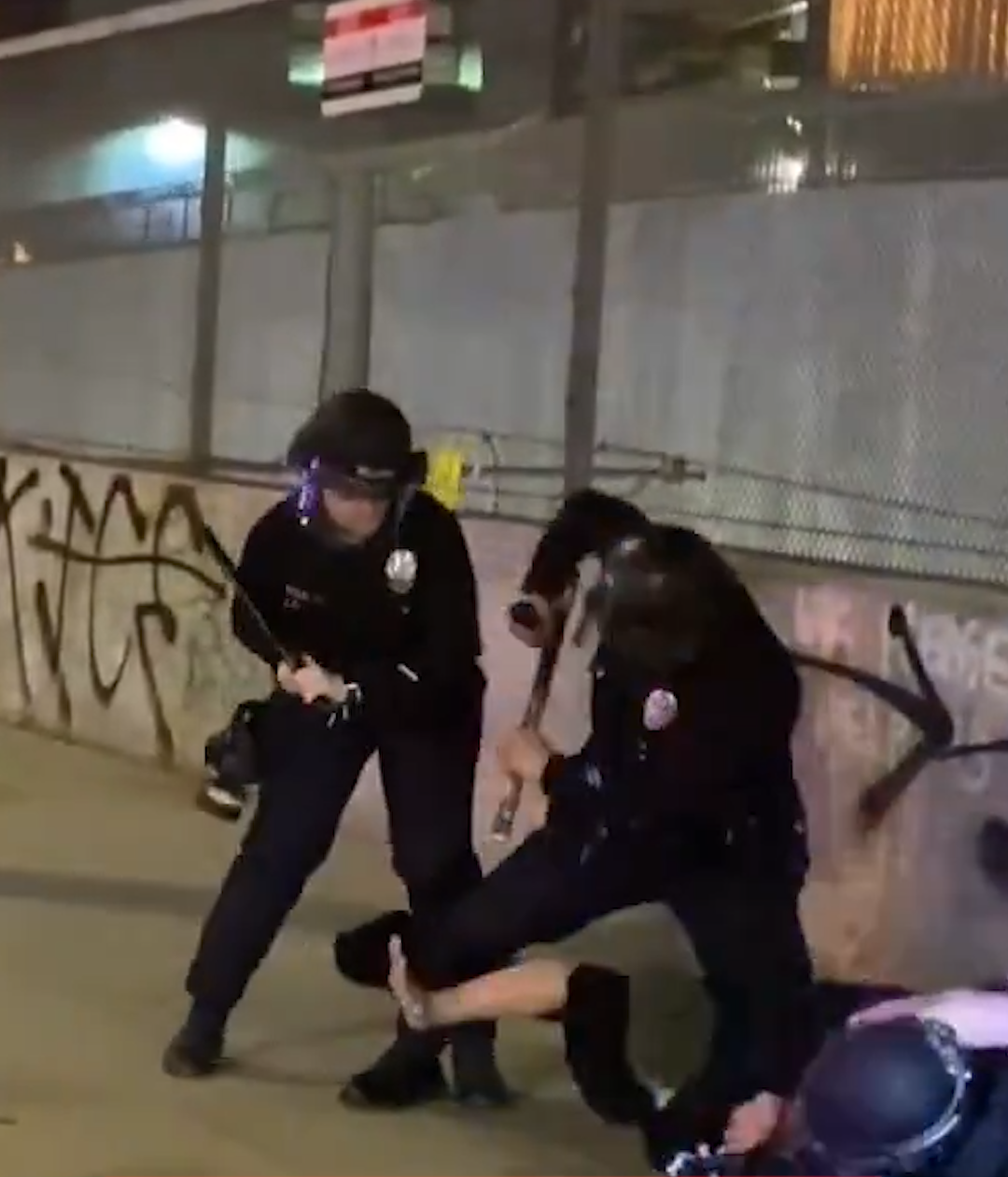 Footage shows LAPD officers advancing on a group of demonstrators and making multiple arrests as they worked to push the crowd back. In one clip, an officer appears to use a baton while attempting to control the situation as protesters refused to move.
