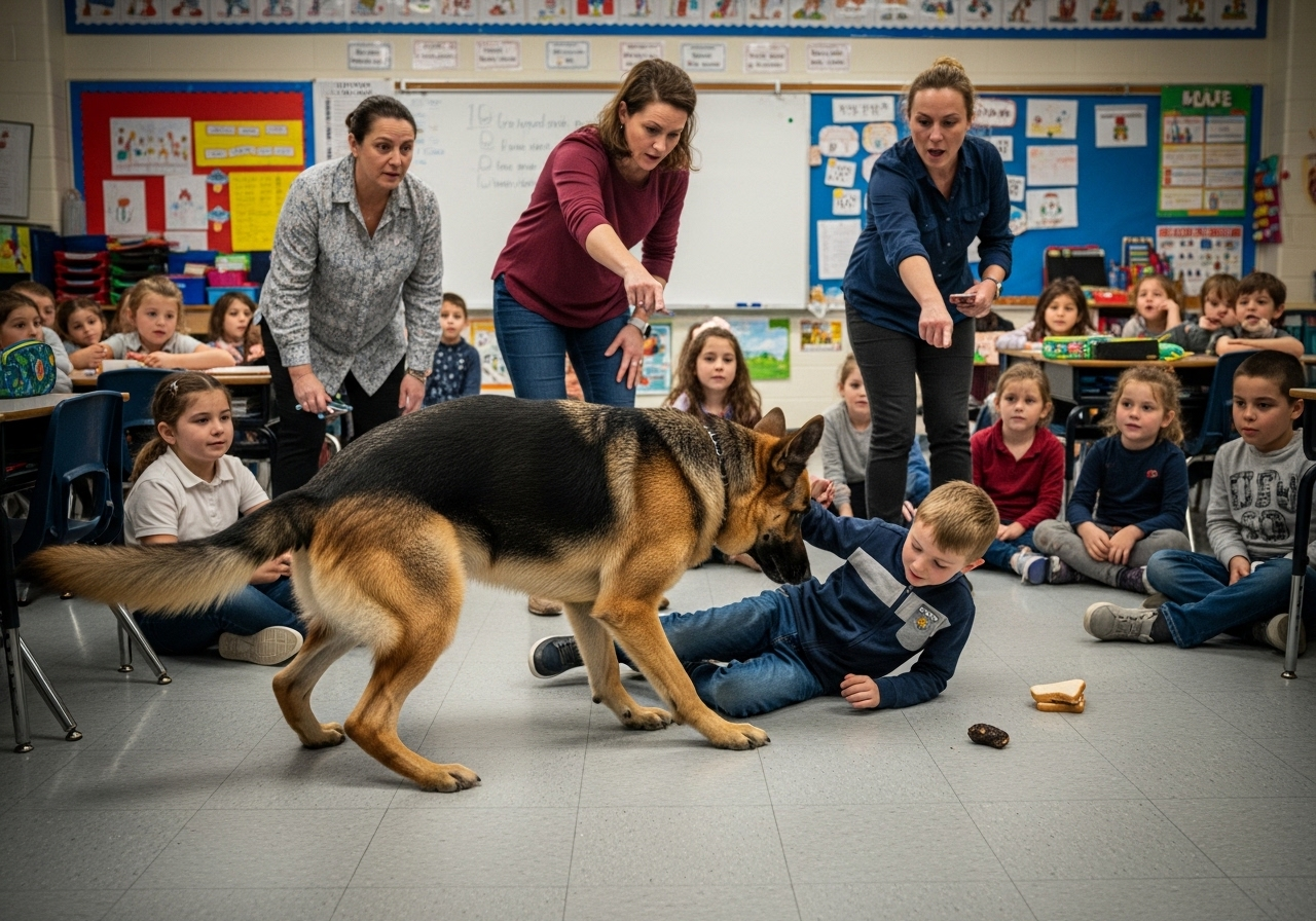 Bear was not a normal dog. He was a purebred, 120-pound German Shepherd, a retired K9 unit that had served with the local county sheriff’s department. Bear was massive. His coat was a deep, imposing black and tan, his chest broad and muscular, and his eyes held a sharp, calculating intelligence that always made me nervous. The school board had granted Mr. Henderson special permission to keep the dog with him on the grounds, citing the dog’s flawless service record and impeccable training.