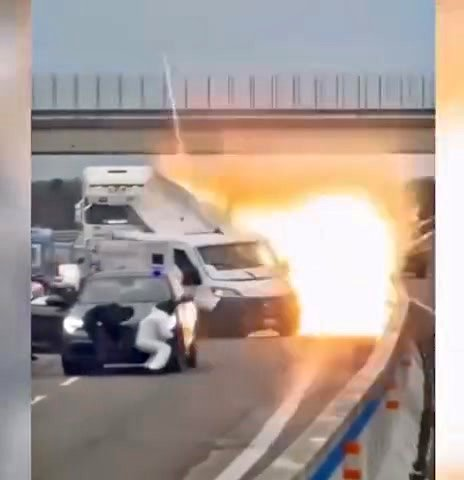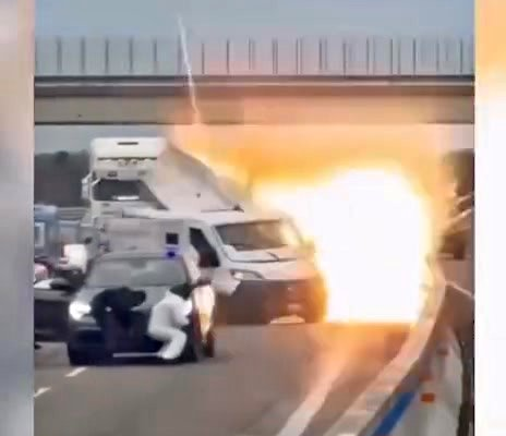 Dramatic footage shows the armoured vehicle being blown into the air, flames and debris billowing across the highway as thick black smoke filled the sky.