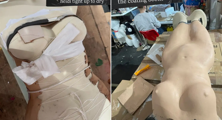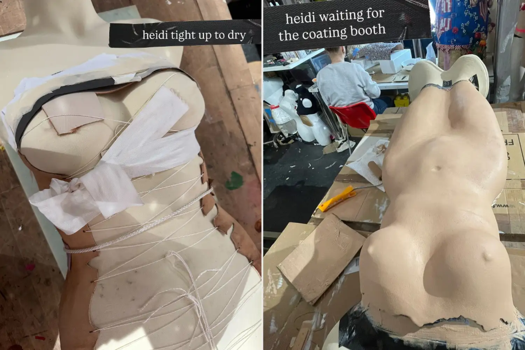 From left: Heidi Klum at the 2026 Grammys; and the making of her Marina Hoermanseder dress.Credit : Amy Sussman/Getty; Marina Hoermanseder/Instagram