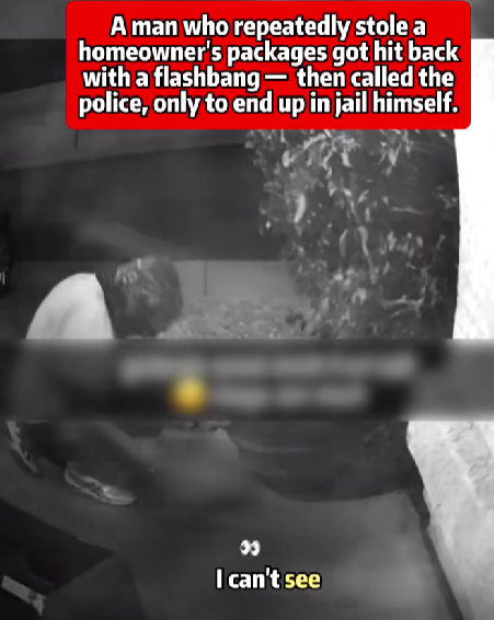 Security footage captured the entire chaotic scene. The video begins with the man sneaking up to the doorstep late at night, glancing nervously around before reaching for a small brown box. But as soon as he lifts it—BOOM! A flashbang device hidden inside the decoy package detonates, filling the air with a blinding burst of light and a deafening bang.