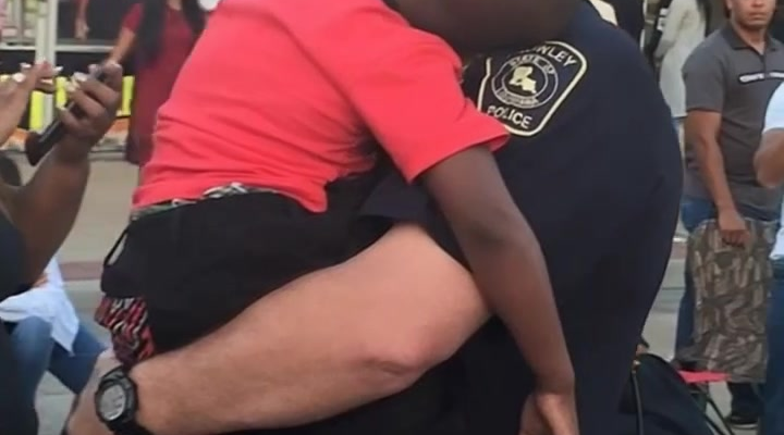 In his arms, a small child rested—head leaning gently against his shoulder, body relaxed, as if the chaos of the surrounding world no longer existed.