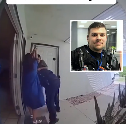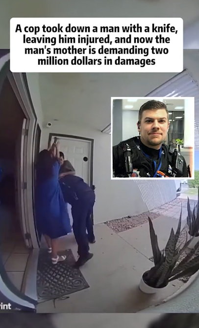 The incident, captured by a doorbell camera, shows a tense confrontation unfolding at the front door of a home. In the footage, the officer can be seen stepping back as the suspect raises a knife, prompting a split-second decision to fire. The chaos that follows is both terrifying and tragic: the suspect collapses, the officer calls for backup, and a woman — later identified as the man’s mother — rushes to his side, screaming for help.