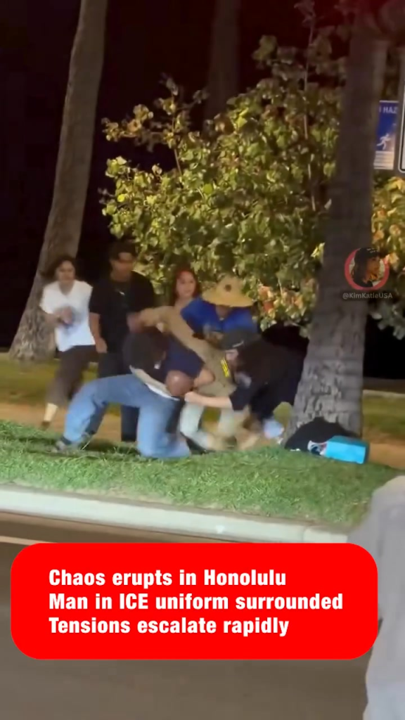 A video circulating online is drawing intense attention after showing a chaotic confrontation during a protest in Honolulu, where a man wearing what appears to be an ICE-style uniform was attacked by a group of individuals.