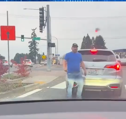 The video begins calmly. Cars idle at an intersection. A mother sits behind the wheel with her child in the back seat. Then a man from another vehicle steps out and approaches her car. His body language appears aggressive — shoulders squared, stride purposeful — as he moves toward the driver’s side. Within seconds, the moment spirals.