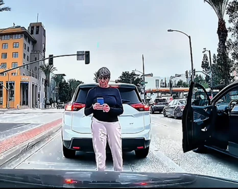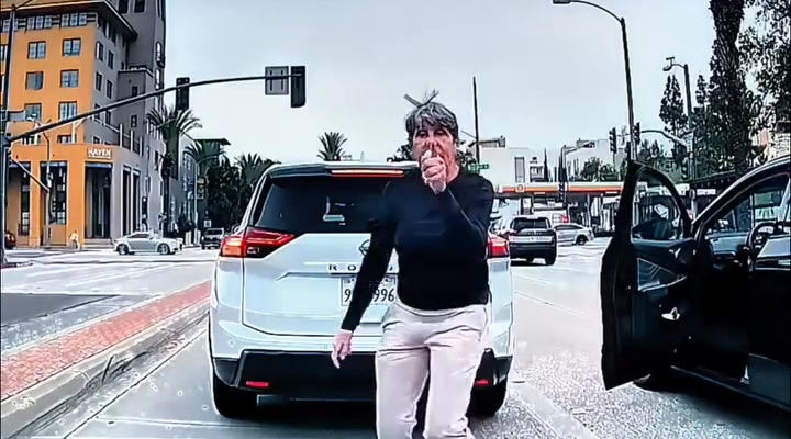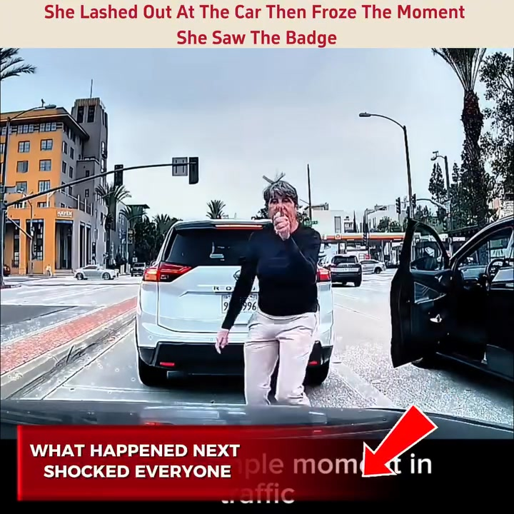 As officers approach, the woman is already engaged in a heated moment. Her movements are sharp and emotional, and her attention is fixed entirely on the vehicle in front of her. The tension is immediate and unmistakable.