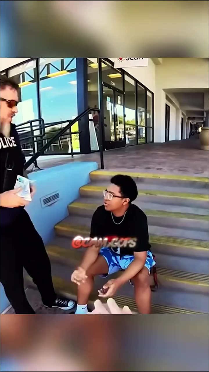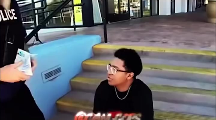 The video begins with the officer instructing the man to stand up and provide identification. The man immediately questions the stop, asking why his ID is needed and insisting he has done nothing wrong. The officer explains that he resembles someone reported for loitering near the ATM.