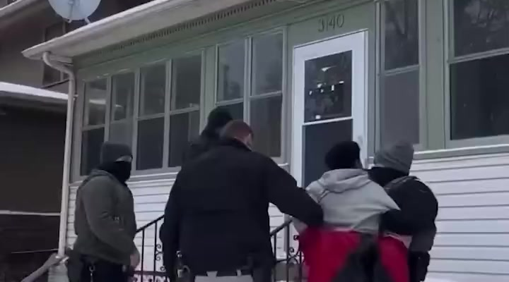 In the video, the man can be seen already handcuffed as agents stand nearby managing the scene. Several bystanders repeatedly ask whether the agents have a warrant to detain the individual, questioning their authority to remain on the property.