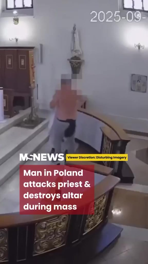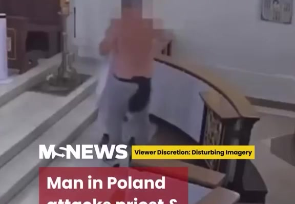 A shocking scene unfolded inside a church in Poland when a shirtless man stormed the altar during mass, attacking a priest and destroying sacred objects in front of stunned worshippers.