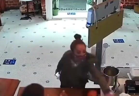 According to staff and witnesses, the confrontation began when a disgruntled customer became aggressive after being told the kitchen was closing for the night. The man allegedly began yelling at employees and throwing jugs of hand sanitizer across the counter, narrowly missing one of the waitresses. The shocking moment, caught on camera, shows the chaos unfolding as staff tried to calm him down.