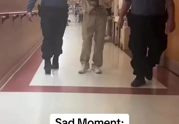 The clip begins with the inmate walking slowly, his hands bound, his steps unsteady. The guards move gently beside him, aware that this moment carries far more weight than a routine transfer. The hallway is silent except for the soft echo of footsteps, creating a scene that feels almost cinematic in its sadness. Viewers say the man’s thin frame, trembling movements, and fragile expression show a lifetime of pain, regret, and longing.