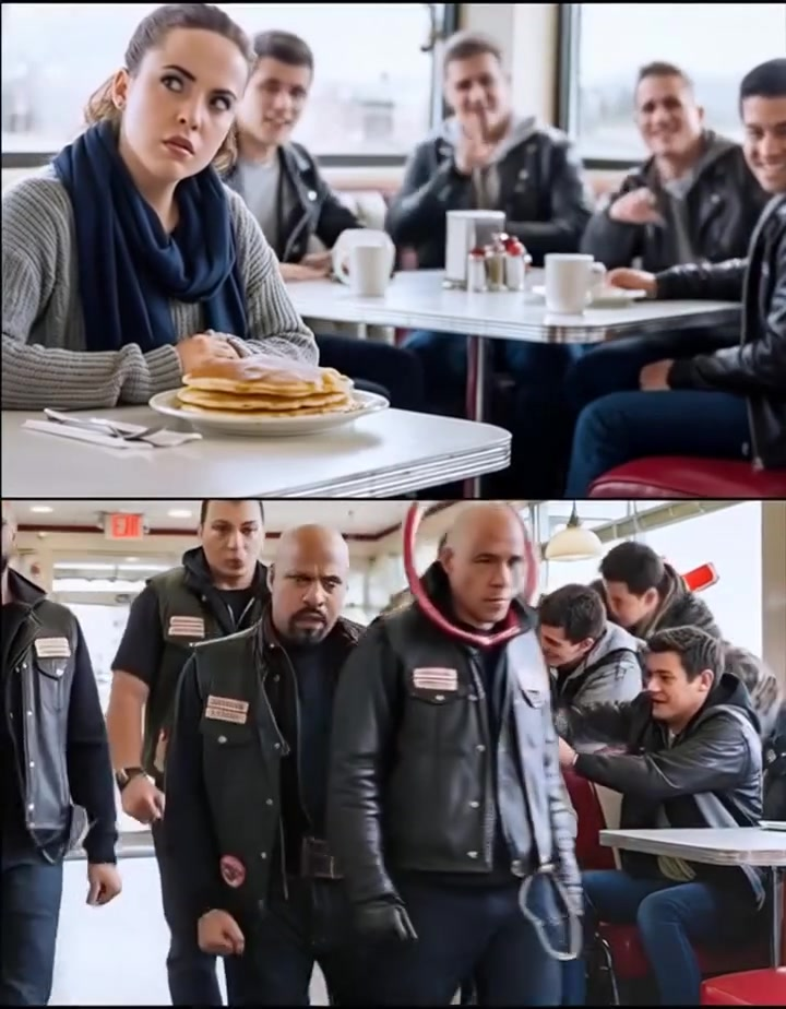 The bikers filled the diner with warmth and laughter, changing the atmosphere completely. Bear, a huge man with a booming laugh, introduced himself first. Liza, who had once been a schoolteacher, promised to help Clara with homework if she ever needed it. Stitch, the club’s go-to for sewing patches, pulled out a needle and thread right there at the table, showing her how he repaired leather jackets after long rides.