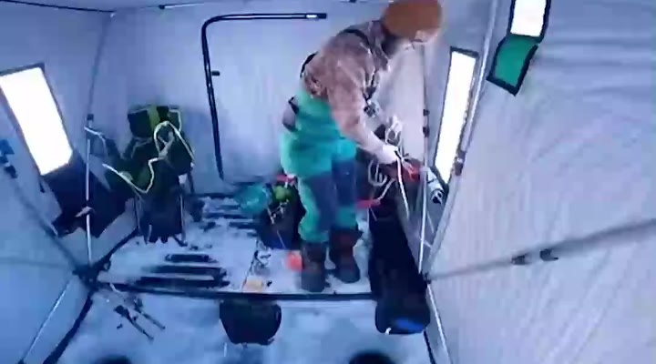 Inside the shelter, the floor is completely coated in ice, gear is scattered everywhere, and the bitter winter light slips in through the small frozen windows. The fisherman, bundled in layers that look heavy enough to weigh down a snowplow, bends over with the determination of someone who has absolutely refused to go home empty-handed. His gloves are soaked, his boots are freezing, and his patience is… hanging by a thread.