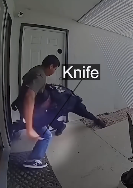 A chilling body-cam moment is making the rounds online after footage surfaced showing a routine doorstep encounter erupt into a sudden, life-threatening struggle. The single word flashing on screen — “Knife” — says everything about how fast the situation spiraled.