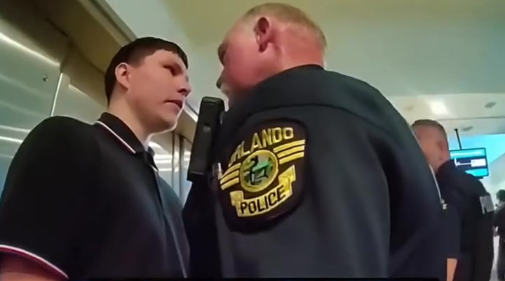 Once removed from the main terminal space, police explain that his behavior could result in charges including disorderly conduct and interfering with airport operations. He appears shocked, acting as though he is the victim despite having caused the entire disruption.