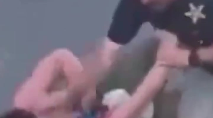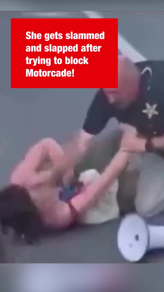 Video from Saturday’s protest shows a woman stepping in front of a police escort. Officers quickly intervened,