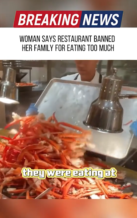The woman claims that after several trips to the buffet line, staff began watching their table closely. When her husband went for another plate of crab legs, an employee reportedly told him that the kitchen was “out for the night,” even though other guests were still being served. Minutes later, a manager approached and allegedly said the family was no longer welcome because of “excessive consumption.”
