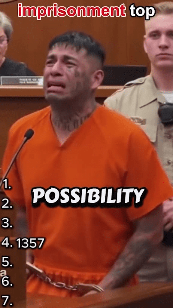 The footage shows the inmate standing before the judge, his hands shackled and his voice trembling as he pleads for mercy. His face, marked by tattoos and exhaustion, reveals the weight of years of regret. When the judge finally announces the sentence — life imprisonment without the possibility of parole — the man’s composure completely collapses.
